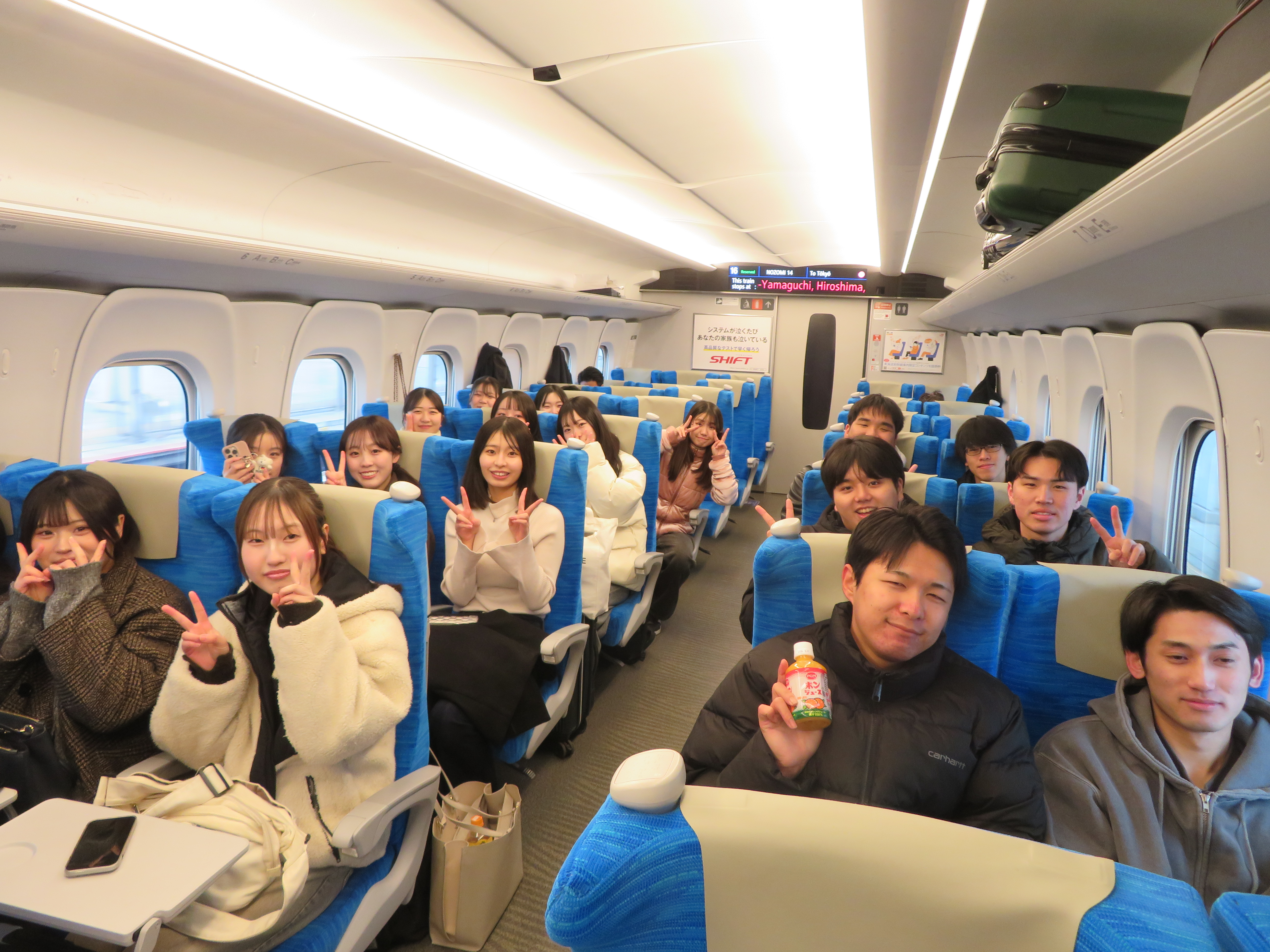 往路新幹線にて。早朝でしたが皆さん無事集合して、いざ出発進行!
