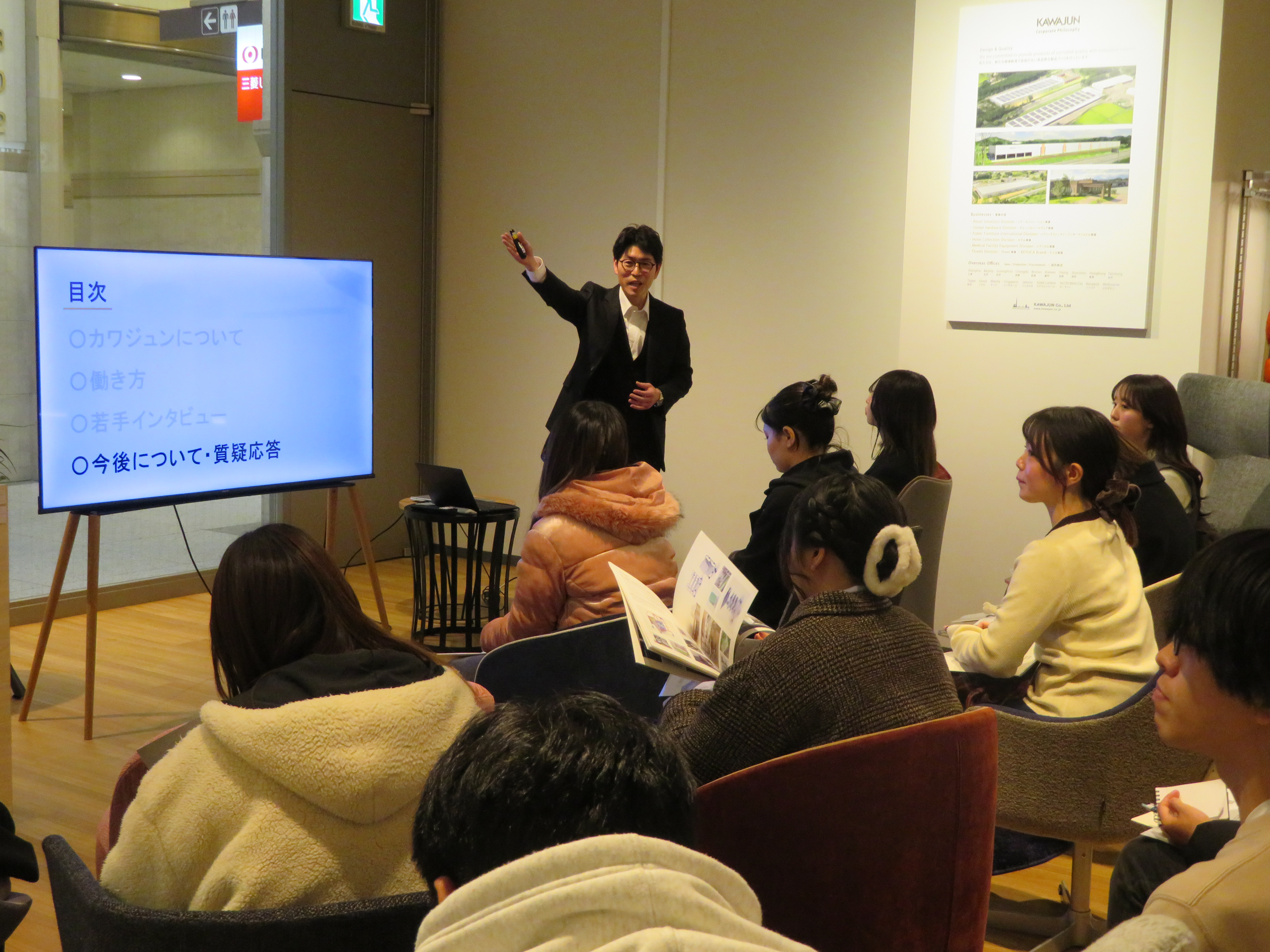 企業説明のほか、河淳オリジナル製品の見学、若手社員の方々による座談会を開催してくださいました。
